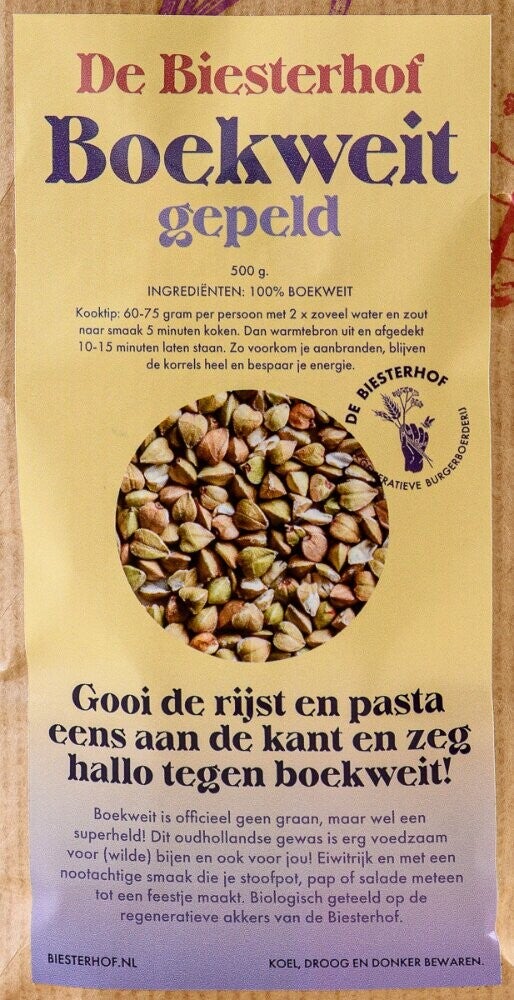 Officieel geen graan, maar wel een superheld. Dit oudhollandse gewas is erg voedzaam voor (wilde) bijen en ook voor jou! Eiwitrijk en met een nootachtige smaak die je stoofpot, pap of salade meteen tot een feestje maakt! Biologisch geteeld op de regeneratieve akkers van de Biesterhof.